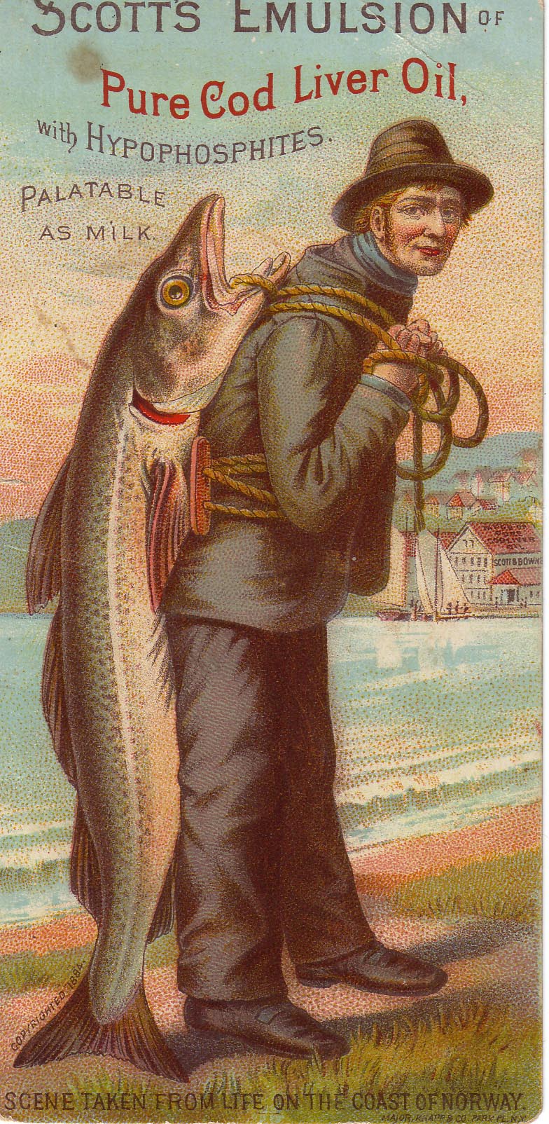 ”Scott’s Emulsion” ble den største konkurrenten til Møller’s tran i løpet av få år og vant priser ved flere store utstillinger. Scott og Bowne var opptatt av reklame og de så nytten av god og fengende reklame kombinert med gratisbrosjyrer, kort, og andre reklameeffekter. De eldste kort og reklamen hadde ikke noe annet varemerke enn navnet ”Scott’s Emulsion”, men en gang på 1880-tallet, kanskje litt tidligere, var Alfred Scott Bowne i Bergen for å kjøpe tran. Han fikk øye på et foto som var til salgs i byens bokhandlere. Fotoet er tatt av den kjente fotograf Marcus Selmer og var averterte i hans første trykte katalog i 1872. ”En fiskdrager fra Bergen” er et studiofoto med et malt bakteppe bak mannen som bære fisken på ryggen. Til venstre på teppet ser vi Michelsensgården på Torvalmenningen, mens vi til høyre ser Fisketorvet, Zachariasbryggen og Finnegården med Fjellsiden bak. Selve fiskebæreren har hodet fastklemt i et klype for å holde ham stille mens fotografiet ble tatt. Han ser ikke blid ut.Det er ikke plass til å fortelle hvorfor Selmer produserte dette fotoet, men det ble solgt til bergensere og turister i likhet med en serie av personer i ”nasjonaldrakter” eller folkedrakter.