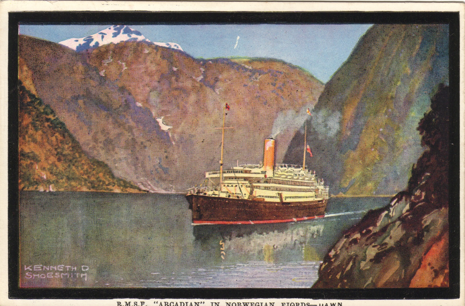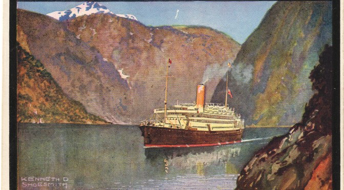 I ”Samling om Postkortet” nr. 49 skrev jeg om den britiske kunstneren Kenneth D. Shoesmith som har tegnet en serie cruiseskip, som senere er blitt trykt på postkort og annet reklamemateriale. På en del av postkortene er skipene i de norske fjordene. Ikke for