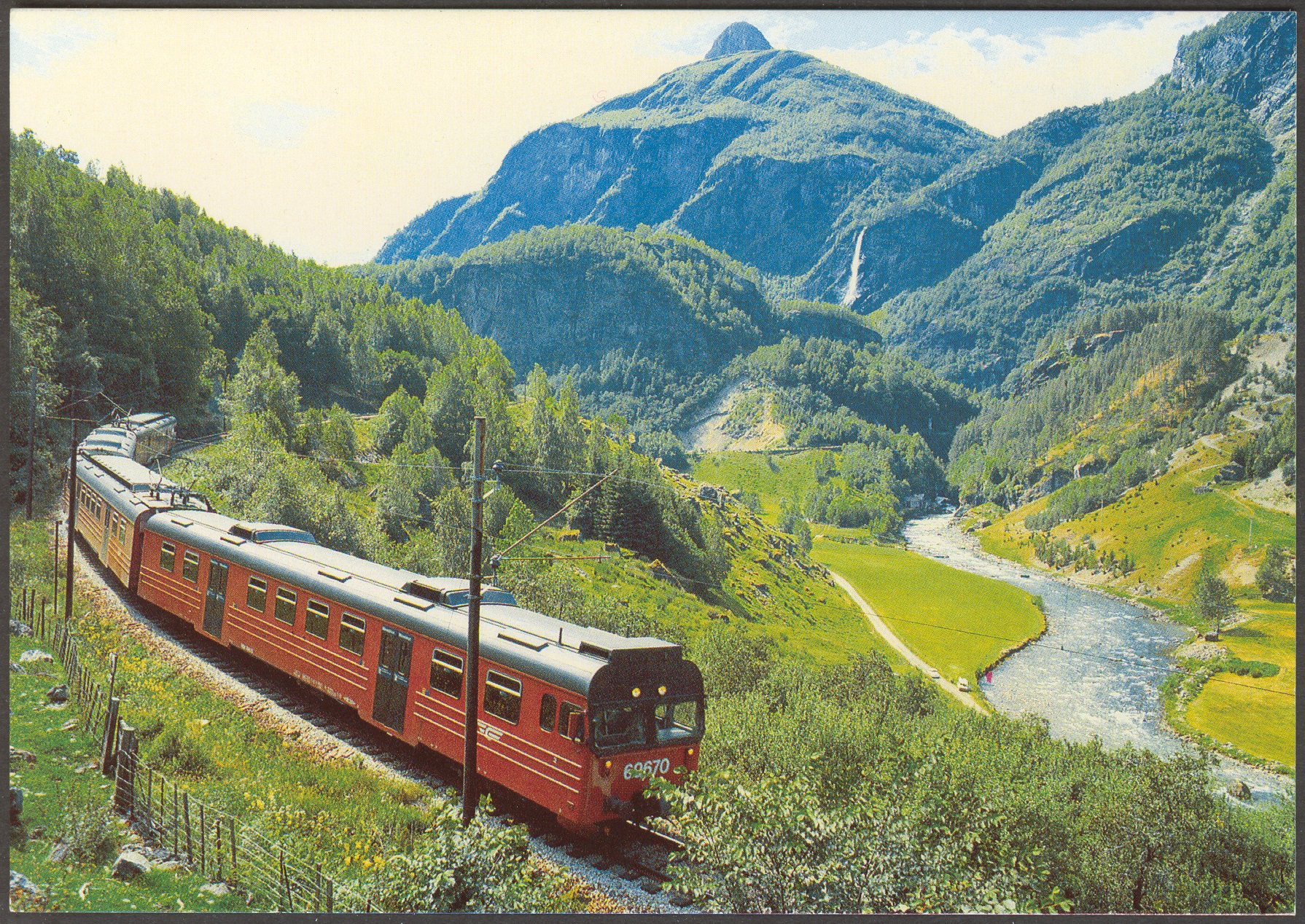 Jeg gikk så frimodig inn i kiosken på Voss stasjon og sa at jeg ønsket et postkort med tog på. Sammen med damen saumfarte jeg postkortkarusellen. Det eneste vi fant var et flott motiv med syklister på Rallarvegen. Det ligger jo utenfor Vossebanen, – men kan passe godt til å avslutte Bergensbane-samlingen med.