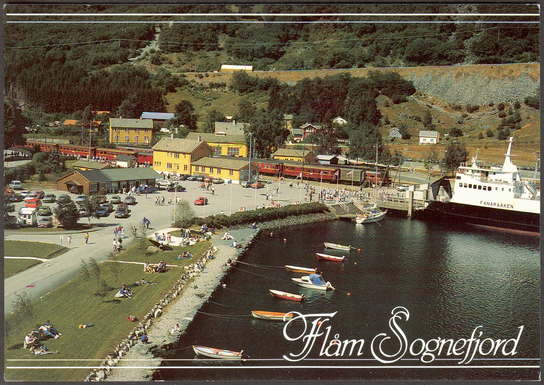 Ned fra stasjonen var det naturlig å titte inn på bensinstasjonen. En rask runde avdekket ingen postkort. Damen var opptatt med å sprute sennep på hot-dogs og plinge inn signal fra bensinpumpene, – men jeg syntes jeg måtte fremsi mitt ærend og ikke bare snuse rundt og gå ut igjen. Da viste hun meg en meget godt skjult postkortkarusell og en eske med ”gamle” kort som det st ”kr. 3,- pr. stk.” på. Du kan få dem billigere hvis du vil ha noen, – og det fikk jeg. De var ikke eldre enn at det var strek-koder på baksiden. Det merkelige var at de kortene jeg sikret meg var flotte jernbanekort fra Flåmsdalen, – men det samler jeg også.