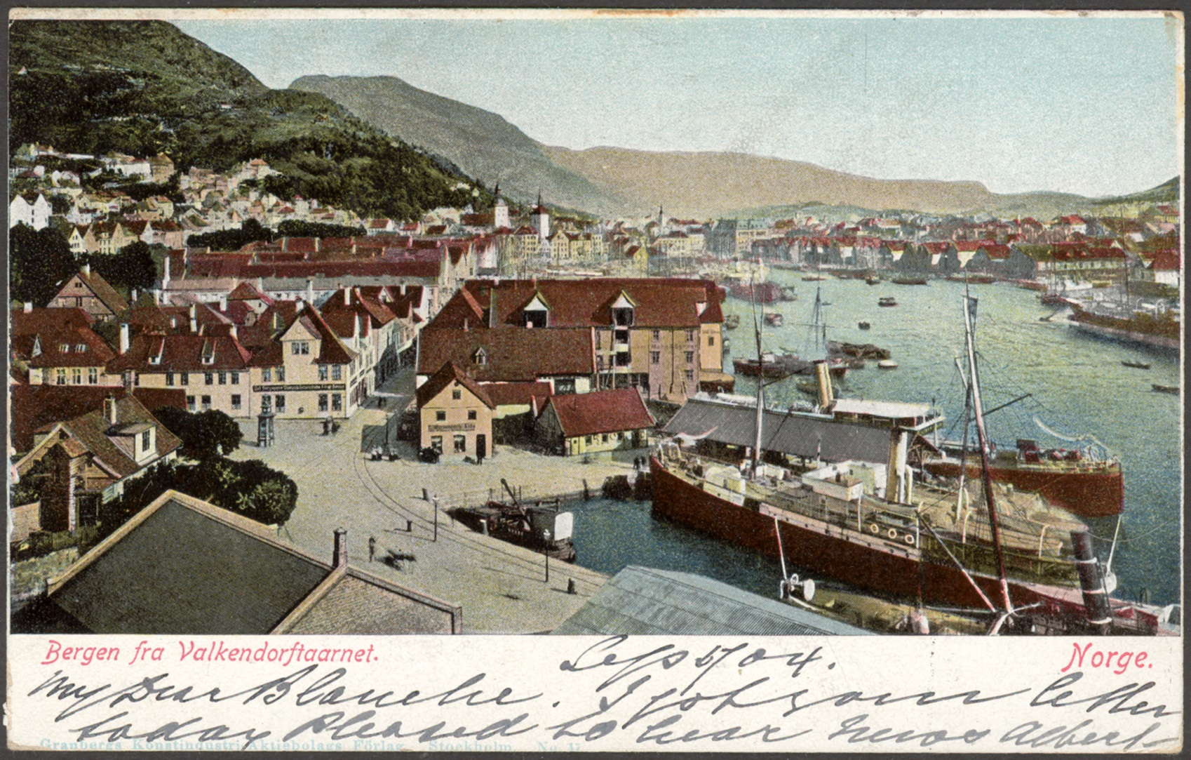Gerda Clarke’s kort har tittel Bergen fra Valkendorftaarnet og det er utgitt av Granbergs Konstindustri Aktiebolags Förlag, Stockholm No 47. Det er poststemplet 5 IX 04. Selv hadde jeg et helt likt kort, men der er det bare angitt G.K.A. No 47.