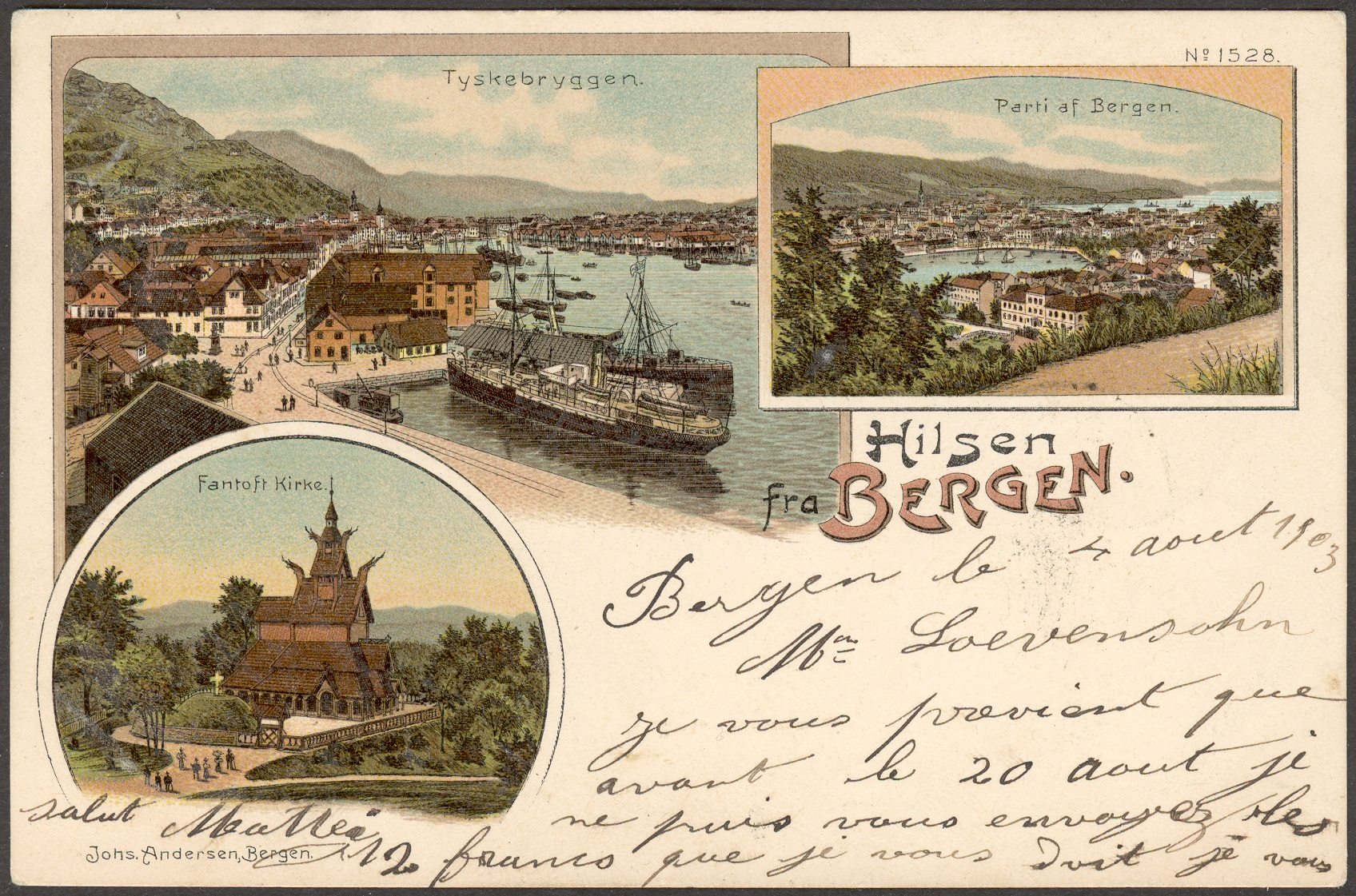 Det merkelige er at samme motiv dukker opp på et Hilsen-fra-Bergen-kort poststemplet 4 VIII 03. Det har No. 1528 øverst til høyre og nede til venstre Johs. Andersen, Bergen. Båtene som ligger ved Bradbenkbryggen ligger i nøyaktig samme posisjon. Det gjør også prammen med heisekran inne i hopen. Tegneren har likevel fjernet BDS-båten ved Bradbenkkaien/Festningskaien, til gjengjeld har han tegnet inn flere personer i bildet. Min påstand er at samme foto er grunnlag for begge kort.
