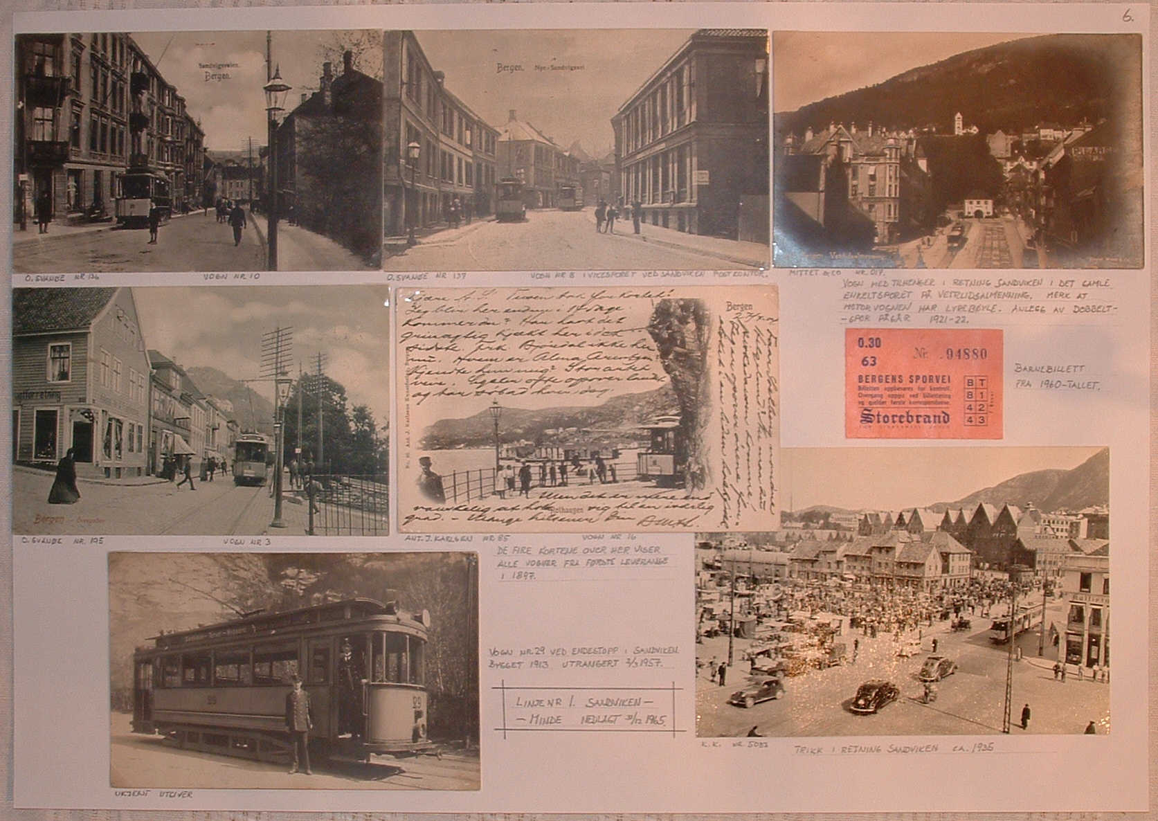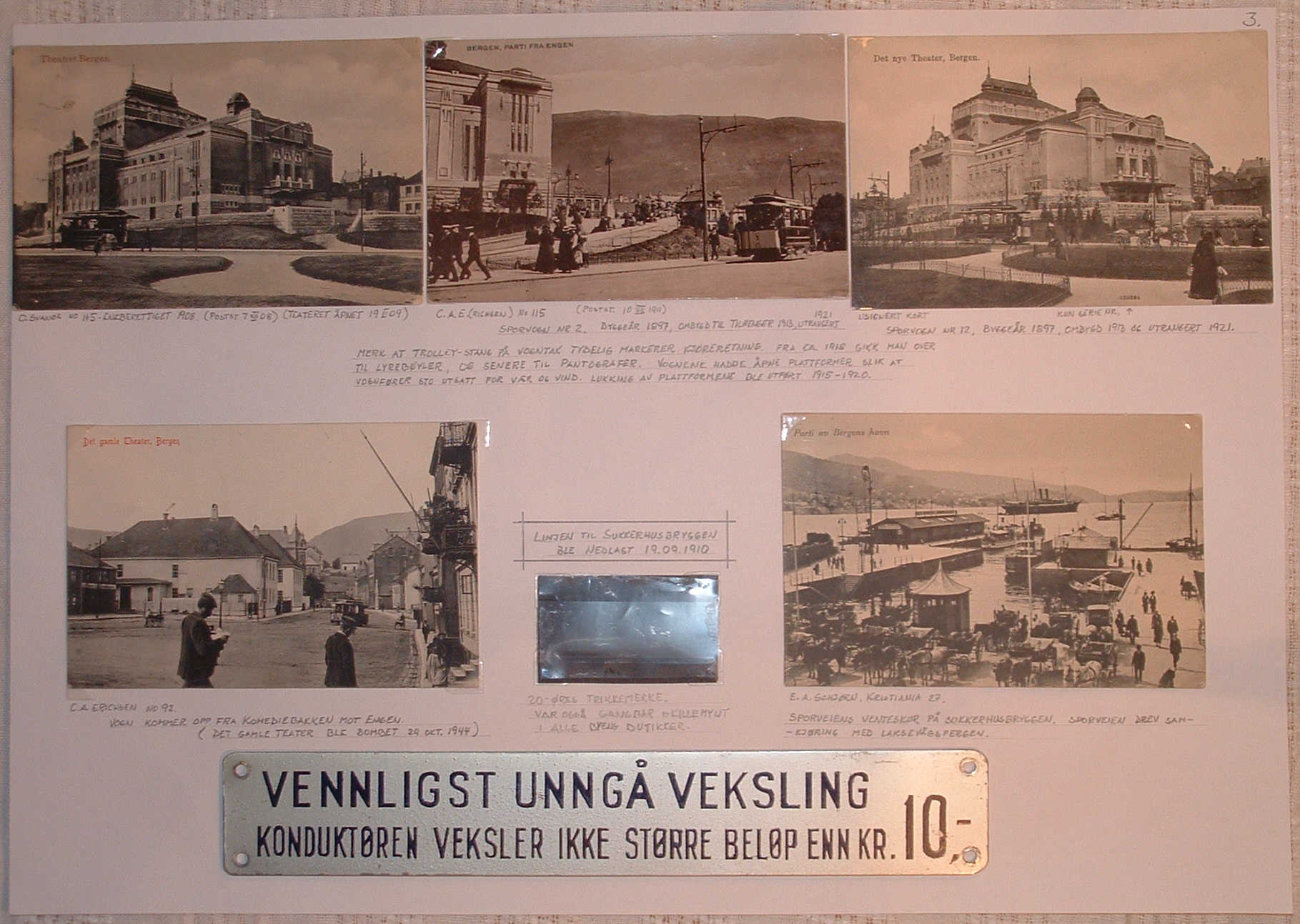 Det er antagelig meg han sikter til igjen – jeg syntes det pyntet godt opp med et par trikkebilletter blant postkortene. (I parentes bemerket vil jeg tro at det er langt vanskeligere å få fatt i en gammel trikkebillett enn et postkort. Trikken i Bergen ble nedlagt 1965). Jeg kan fortelle at jeg i tiden før utstillingen var på ivrig jakt etter ”trikkemerker”. Dette var 20 øres mynter (pollett heter det visstnok hos myntsamlerne), firkantet med avrundede hjørner. Taksten for en voksen person var 20 øre i perioden 1920-1949. I sporvognlitteraturen ser vi at: