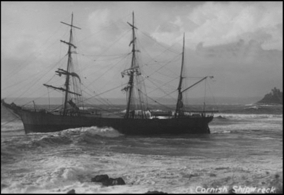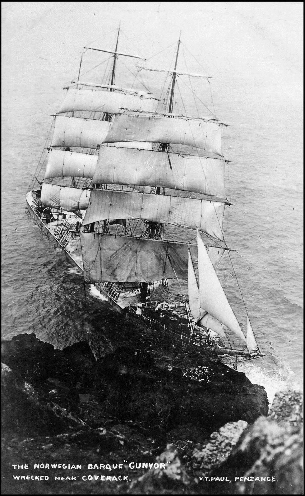 Et godt eksempel på postkort av et norsk skipsvrak ved Cornwall er avbildet her. Det er stålbarken ”Gunvor” som var eiet av skipsreder G.C. Brøvig i Farsund. Det er flere postkort med Gunvor strandet opp mot bergene ved The Lizard. Skipet ble bygget i Rouen, Frankrike i 1895 og fikk navnet ”General Mellinet”. Det hadde en netto tonnasje ca.1500 tonn. I 1905 ble skipet solgt til Brøvig i Farsund. Kapteinen i perioden 1905-1912 var Th. Salvesen ifølge Sjøhistoriske database. En tåket aprilnatt, 5.april 1912, var skipet på vei til Falmouth med bl.a. salpeter fra Caleta Buena, Chile, da det traff klippene ved Black Head, the Lizard. Heldigvis var skipet så nær land at hele den norske besetningen kunne klatre i land ved bruk av ropeladder, og ingen mistet livet. Det var sjelden det gikk så bra med skipene rundt Cornwallkysten. Sjøforklaringen ble holdt i Falmouth og det sies at årsaken til ulykken var uaktsomt navigering. Kapteinen sies å være idømt bøter.